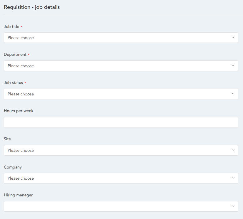 Job status* - Select from a Job Status within your organisation. Note: Job Statuses can be added or edited by navigating to Admin - HR - Data Management - Job Status.