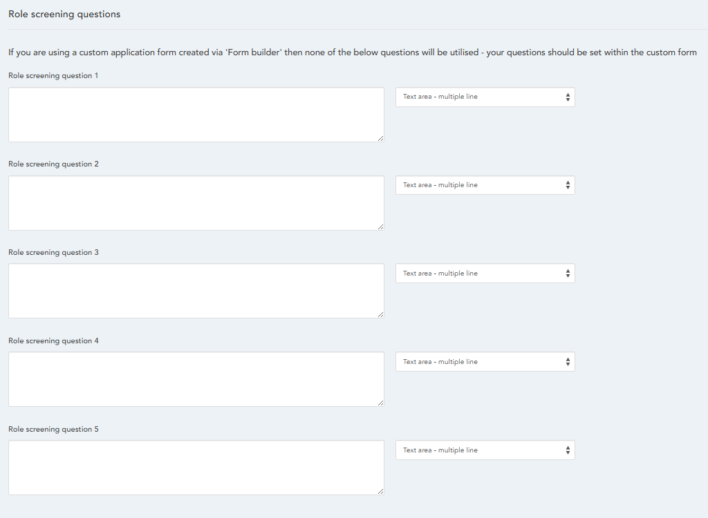 The below Questions can be used in tandem with the questions entered on your List Page Settings. The difference between these and the list page questions is that these will be role specific. Note: If you are using a custom application form created via 'Form builder' then none of the below questions will be utilised - your questions should be set within the custom form.