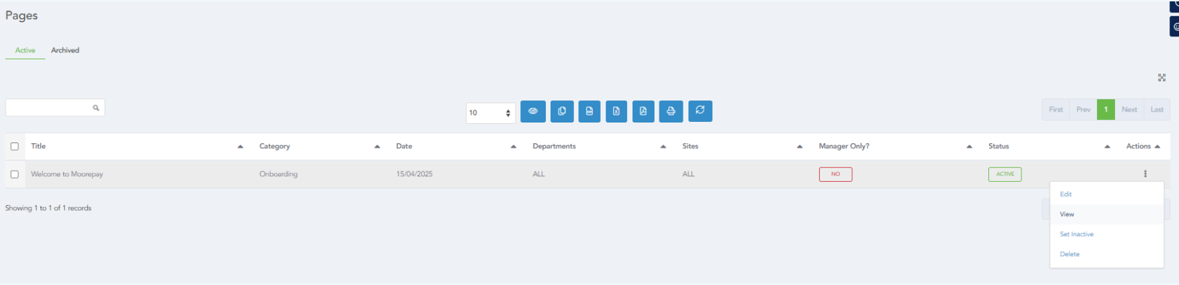 If you want to hide pages from employee's whilst adding or editing them, you can set them as inactive when creating them or click on the Actions - Set Inactive when viewing your list of pages: