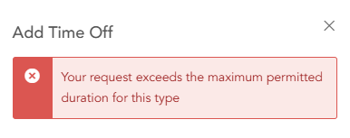 When a period of time off has been entered by an employee that exceeds the limit set in the respective time off type, they will be presented with the following message: