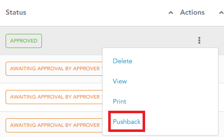 In order to pushback mileage the approver can navigate into Finance -> Mileage, locate the mileage claim they'd like to pushback and click the Actions button followed by Pushback.