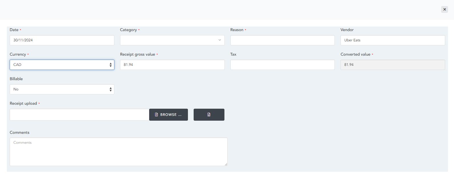 After you've submitted the necessary receipts, the "Start Upload" button will allow you to upload these receipts, which will create and redirect you to a new, automatically populated expense claim:
