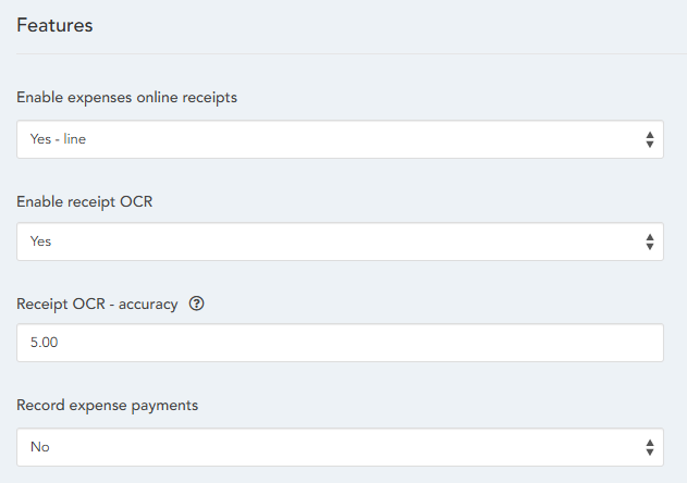 Below the enable field is also the "Receipt OCR - accuracy" field. When using OCR, depending on the quality and clarify of the receipts, there may be times when the OCR cannot reliably determine the values to use. Each receipt which is read has an accuracy score and you can adjust this score using the accuracy field - the lower the score will mean you will get more values filled in, but these are more likely to have errors, especially on unclear or damaged receipts. If you choose a higher number, then you are more likely to have blanks, or missing data, but the data that is populated will be of a higher accuracy.