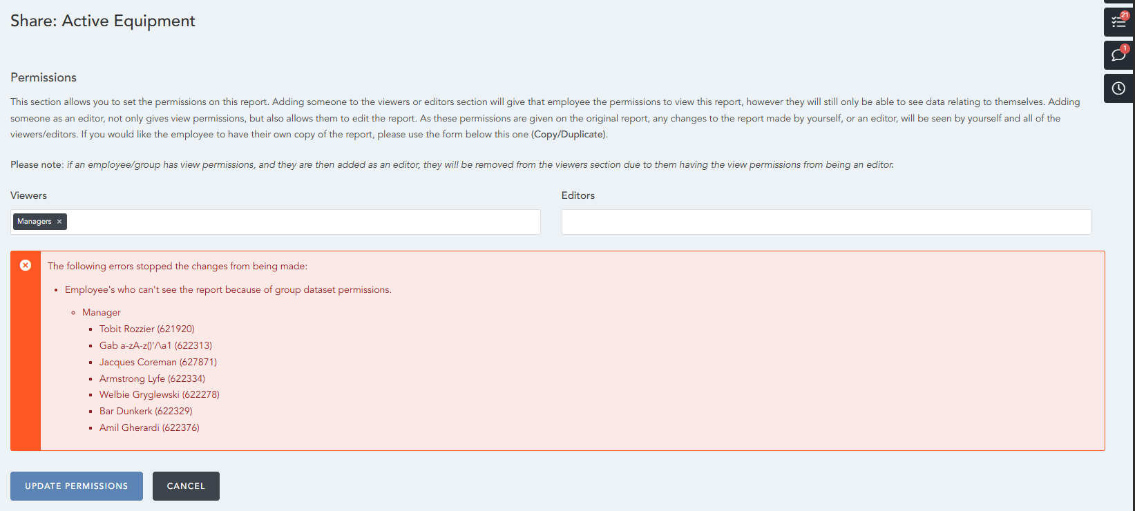 After creating and then attempting to share a report to a user, you may see an error that looks like this: