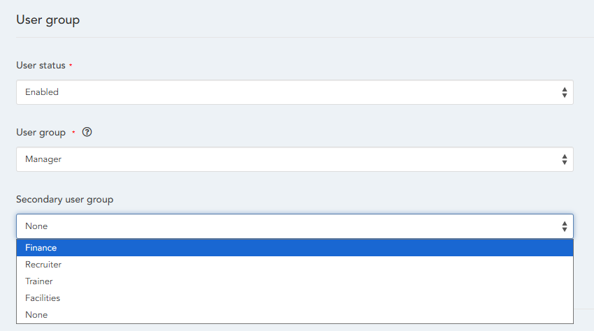And then, after clicking on the 'Edit' button for a user, go to the 'User group' section and select 'Finance', 'Trainer' or 'Facilities' from the 'Secondary user group' dropdown option. This means that a manager with a 'Trainer' secondary user group for instance, can see all employees from reports based on the training data sources, but for reports based on all other datasets, they can only see their direct reports.