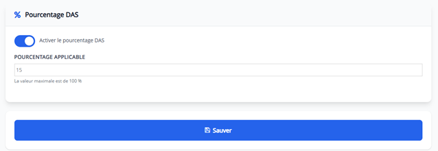 - Dans la section « % Pourcentage DAS », activez l’option Activer le pourcentage DAS.