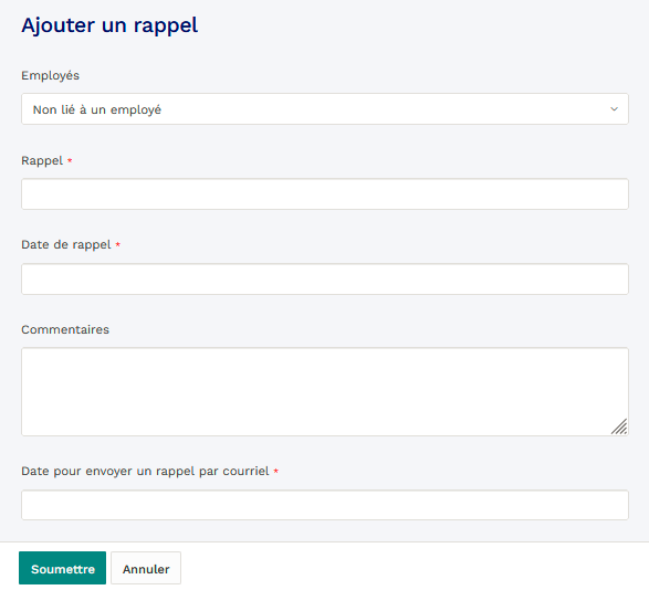 Cliquez sur le bouton Ajouter pour créer un nouveau rappel. Choisissez le nom de l'employé concerné par le rappel dans le menu déroulant Employé, saisissez le titre du rappel dans le champ Rappel. Choisissez une date de rappel et une date d'envoi du courriel de rappel.