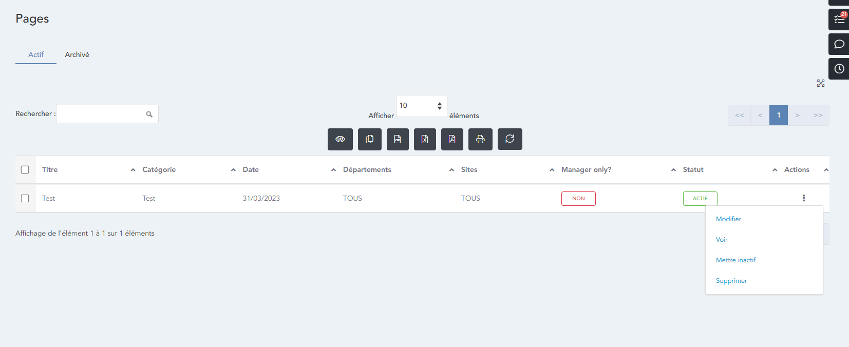 Si vous souhaitez masquer des pages aux employés pendant que vous les ajoutez ou les modifiez, vous pouvez les définir comme inactives lors de leur création ou cliquer sur Actions - Mettre inactif lorsque vous affichez votre liste de pages :