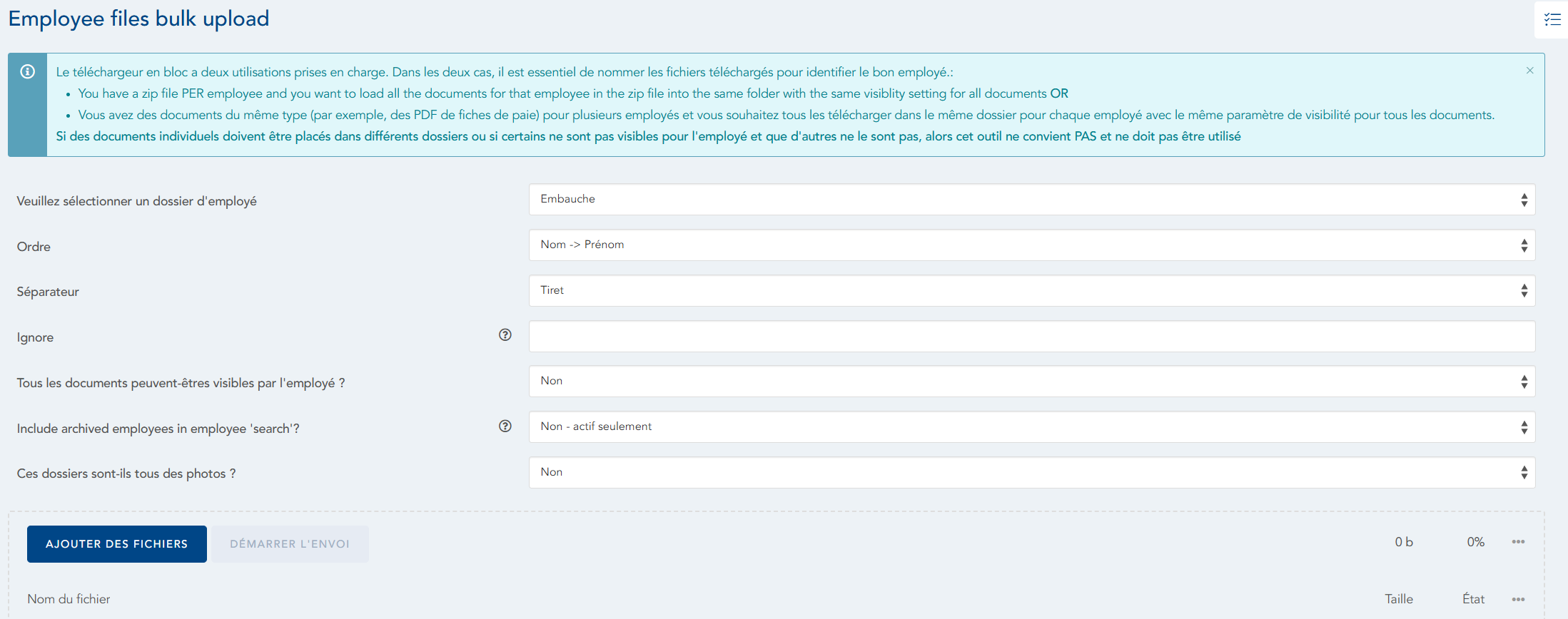 Lors du téléchargement de documents d'employés, il convient de différencier quel type de document va dans quel dossier. Par exemple, si tous les fichiers sont nommés Contrat Jean Dupont, le système recherchera un employé nommé Contrat Jean Dupont, à moins que les conditions préalables appropriées ne soient définies.