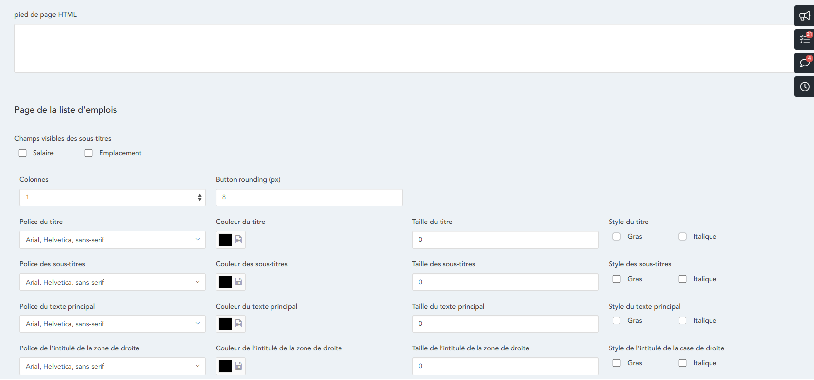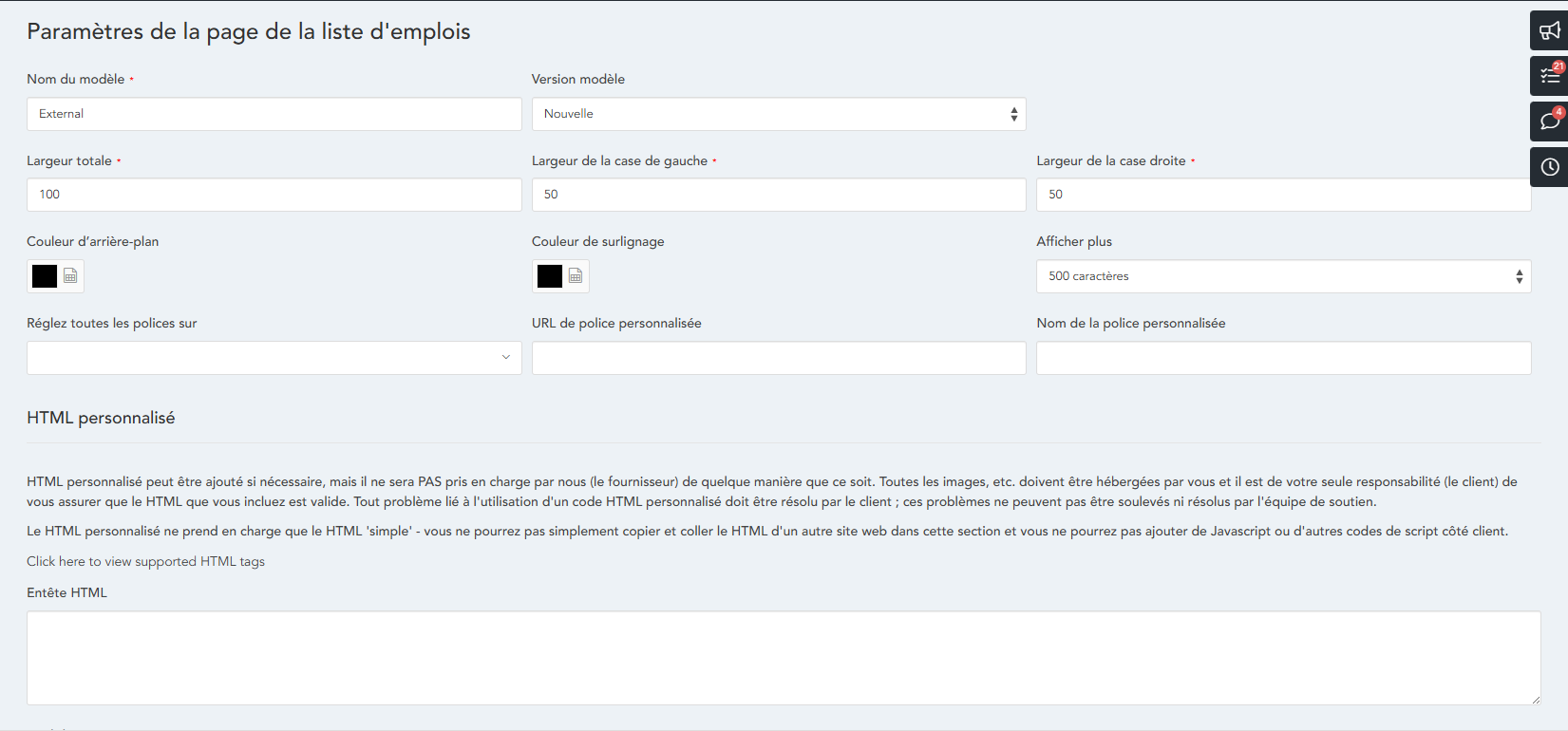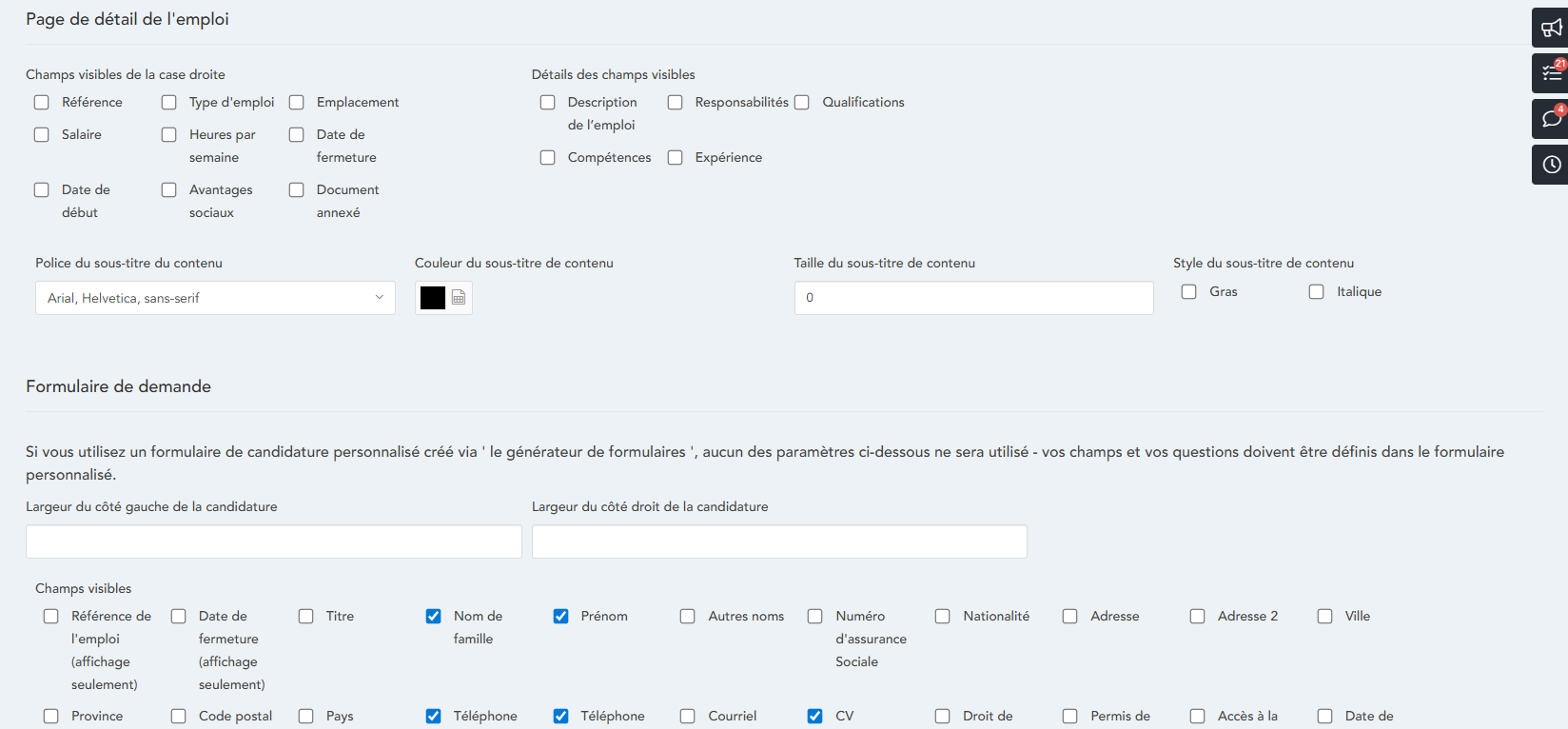 Remplissez autant que possible les sections "Page de la liste d'emplois", "Page de détail d'emploi" et "Formulaire de demande". Au bas de la page, vous pouvez ajouter jusqu'à 10 questions personnalisées qui apparaîtront sur toutes les demandes.