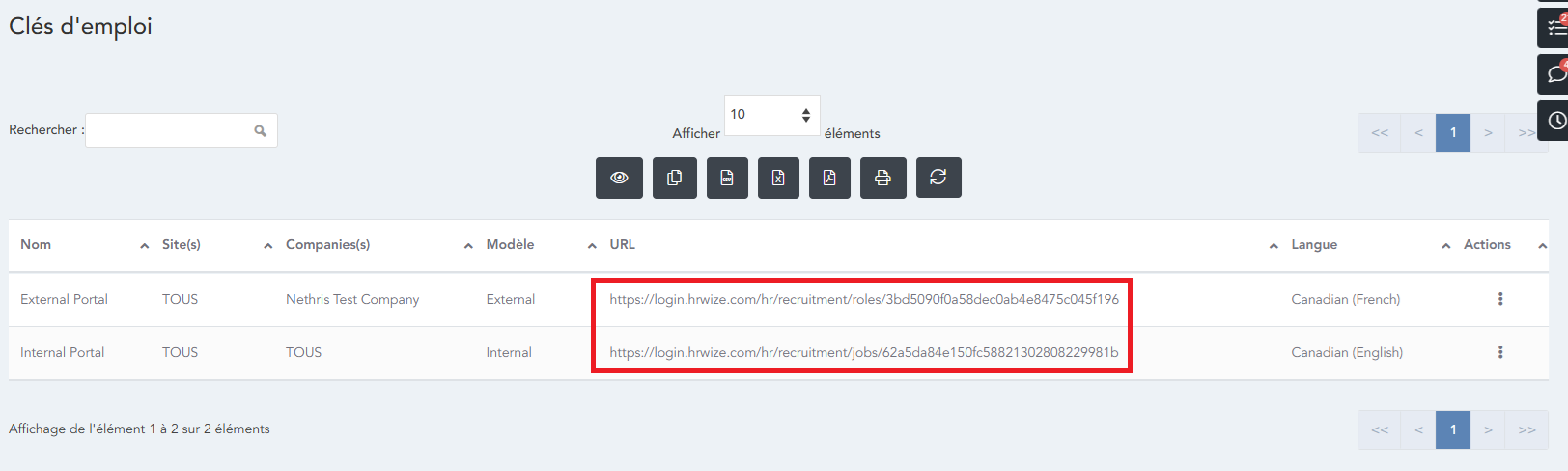 Une fois soumis, vous obtiendrez votre clé de poste sur la page des clés du portail de l'emploi. Vous pouvez cliquer sur Ajouter pour créer d'autres clés de portail si vous souhaitez configurer des pages Web pour différents sites et/ou langues. Faites une copie de l'URL, car il s'agit de la clé qui sera utilisée sur la page "Carrières" du site web de votre entreprise.