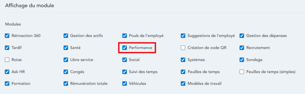 Vous pouvez ensuite consulter ces informations en cliquant sur le bouton « Actions », puis sur « Afficher ». Si vous affichez différents modules via le libre-service, le module « Performances » devra également être activé dans les « Paramètres d'affichage » sous « Modules du libre-service » :