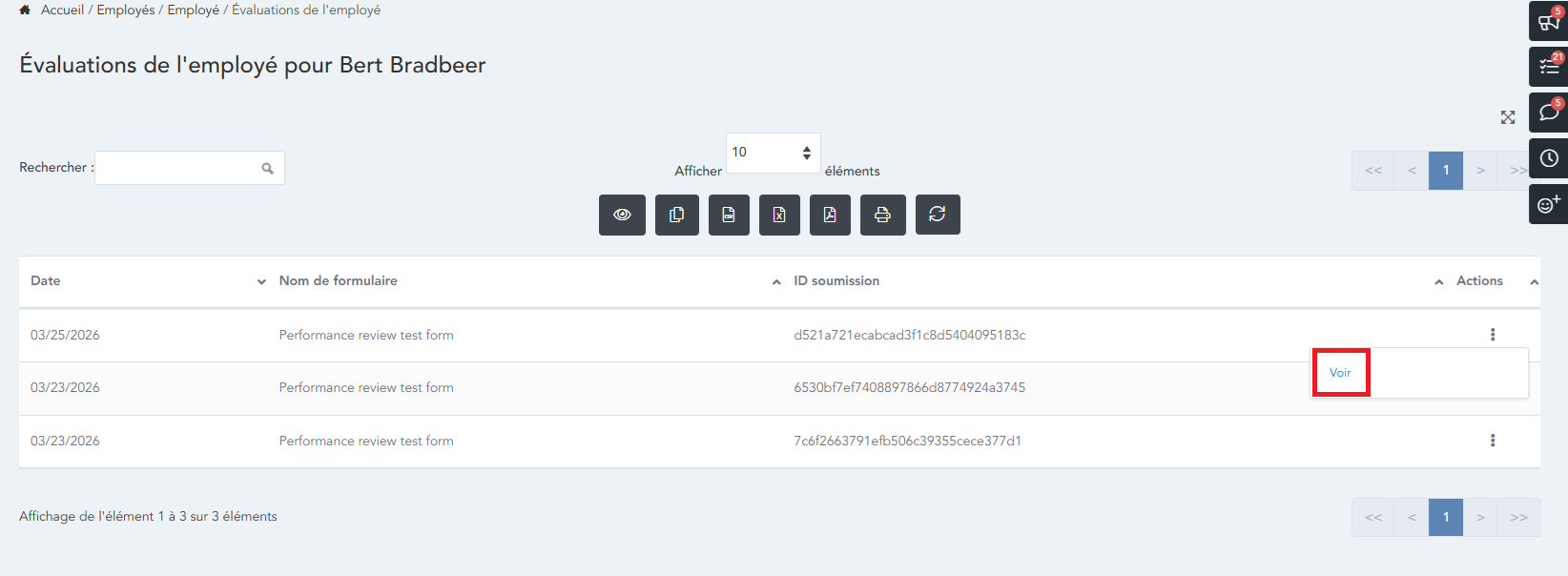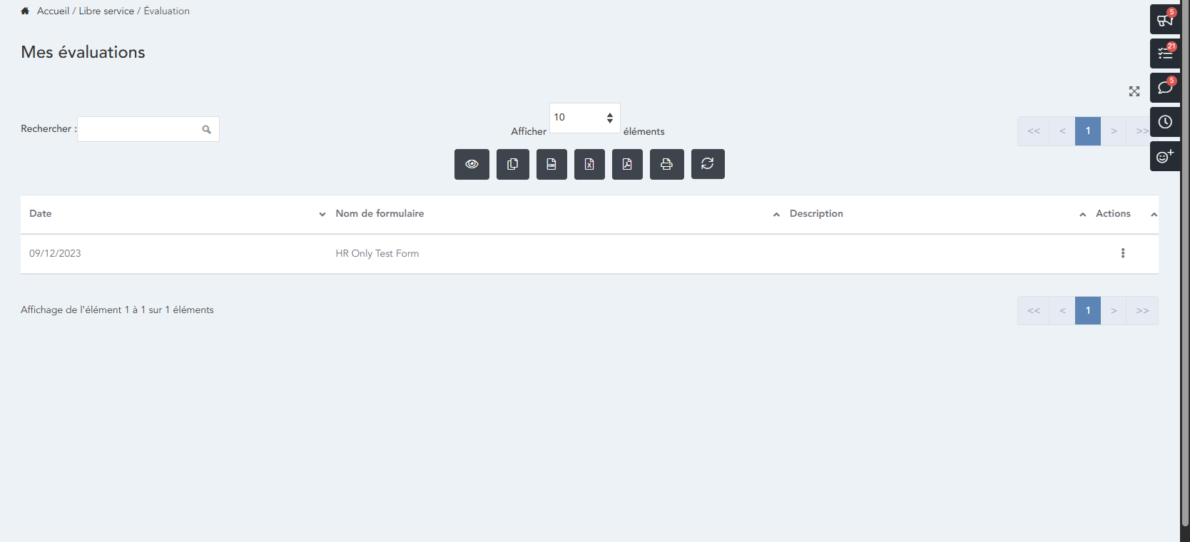 Les utilisateurs disposant d'un rôle d'administrateur ou de responsable des ressources humaines pourront également accéder aux évaluations de cette manière, ou bien se rendre dans Performance -> Formulaires d'évaluation. Ils y trouveront la liste complète de tous les formulaires d'évaluation des performances.
