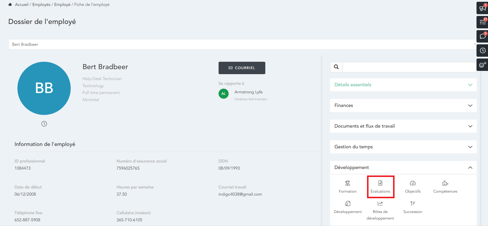 Les responsables pourront consulter les évaluations de performance de leurs subordonnés en accédant à leur fiche, en développant l'onglet « Développement », puis en cliquant sur « Évaluations » :