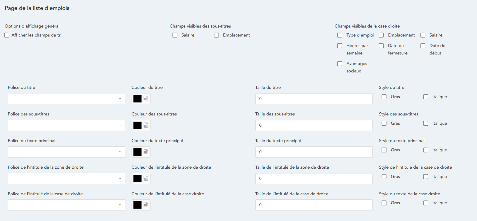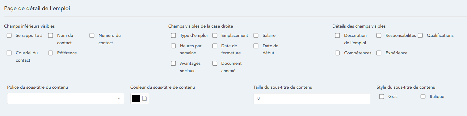 - Taille du sous-titre du contenu - Entrez la taille de la police pour vos sous-titres dans la page de liste des offres d'emploi.