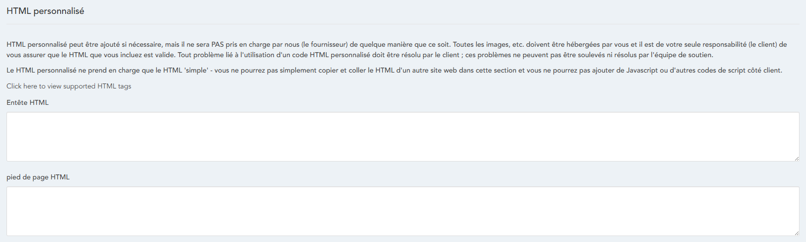 - HTML d'en-tête et HTML de pied de page - Vous pouvez ajouter du HTML personnalisé si nécessaire, mais celui-ci ne sera PAS pris en charge par nos services. Toutes les images, etc. doivent être hébergées par vos soins et il vous incombe exclusivement de vous assurer que le code HTML que vous incluez est valide. Tout problème découlant de l'utilisation du HTML personnalisé doit être résolu par vous. Ces problèmes ne peuvent pas être signalés à l'équipe d'assistance ni résolus par celle-ci. Le HTML personnalisé ne prend en charge que le HTML « simple ». Vous ne pourrez pas simplement copier-coller du code HTML provenant d'un autre site web dans cette section, ni ajouter de code Javascript ou tout autre code de script côté client.