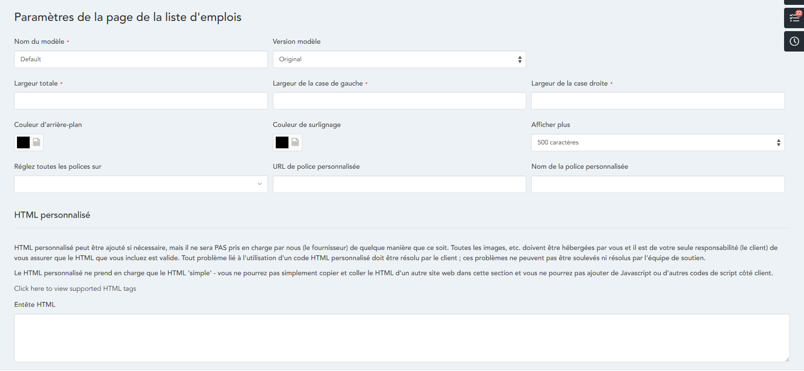 - Largeur du côté droit de la candidature - Il s'agit de la largeur de la case de droite lorsque vous accédez au formulaire de candidature sur votre portail d'emploi. Elle peut être modifiée pour être plus large ou plus étroite en fonction de l'affichage souhaité sur le portail. Entrez une valeur comprise entre 0 et 100. Nous vous recommandons d'entrer la différence par rapport à la largeur de la case de gauche afin d'obtenir la largeur totale. Par exemple, si la largeur totale est de 100 et la largeur de la case de gauche de 60, la largeur de la case de droite sera de 40.