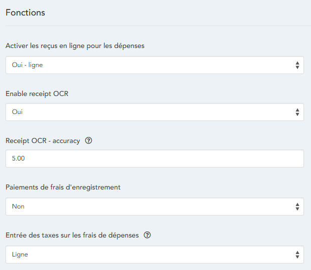 Ce paramètre peut être activé dans Administration > Entreprise > Paramètres > Dépenses > Paramètres des dépenses via le champ « Activer la reconnaissance optique de caractères des reçus » :