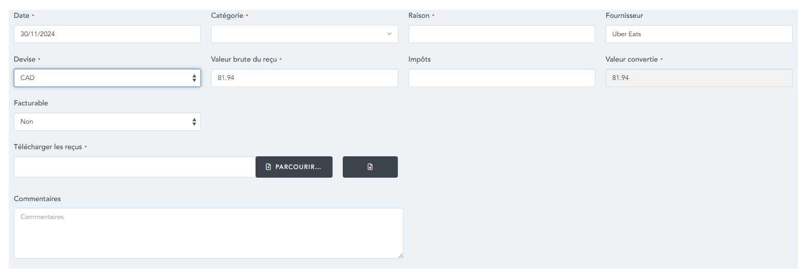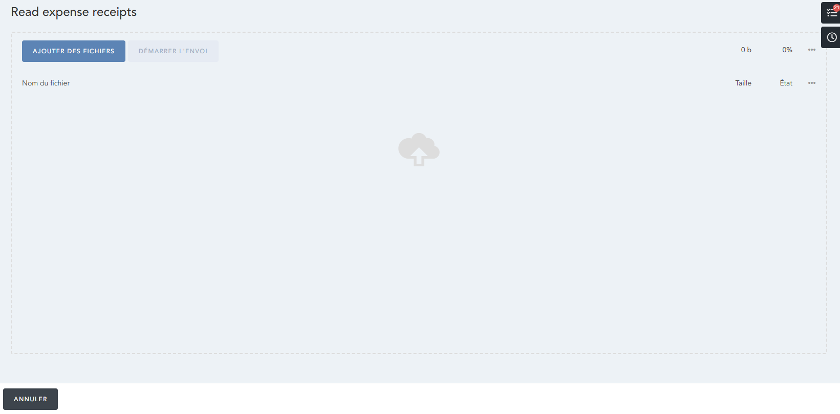 Une fois que vous avez soumis les reçus nécessaires, le bouton « Démarrer le téléchargement » vous permettra de télécharger ces reçus, ce qui créera une nouvelle note de frais préremplie et vous redirigera vers celle-ci :