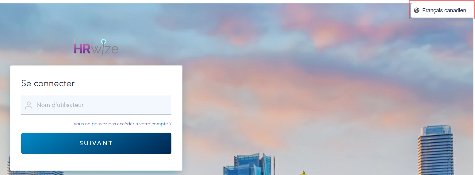 Vou devriez désormais être « redirigé » vers IDS, ce qui signifie que lorsque vous vous connectez à HRWize via login.hrwize.com/login, vous verrez l'URL de votre navigateur changer avant d'accéder à votre page de connexion officielle. À partir de là, vous pouvez choisir votre langue (en haut à droite), puis saisir votre nom d'utilisateur et votre mot de passe. Il est important de sélectionner la bonne langue, car celle-ci s'appliquera à votre profil HRWize une fois que vous serez connecté. Votre préférence linguistique sera conservée pour vos prochaines connexions.