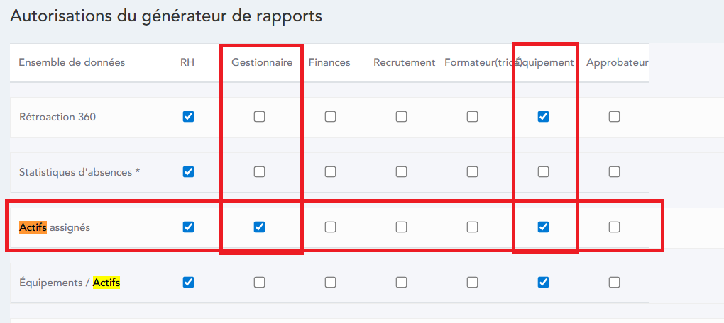 Dans ce cas, nous souhaitons accorder à nos gestionnaires et à nos utilisateurs des équipements l'accès à la source de données de gestion des actifs. Nous cochons donc la case correspondant à la ou aux sources de données que nous souhaitons que l'utilisateur puisse afficher dans ses rapports: