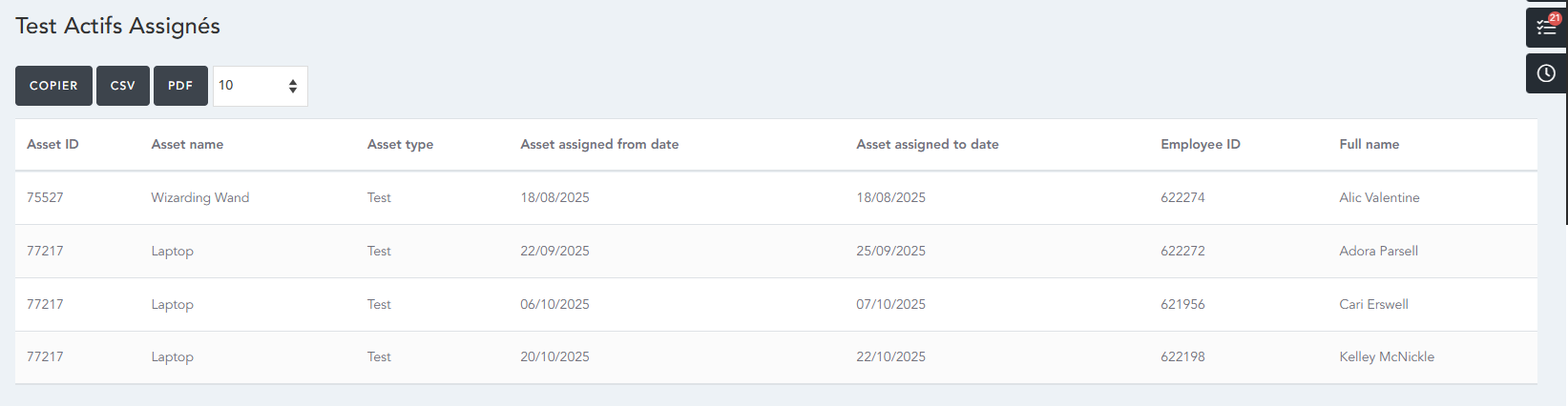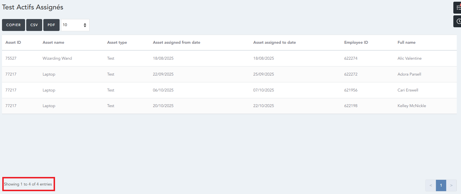 Dans cet exemple, le groupe d'utilisateurs de l'employé est « Equipments », il peut donc exécuter le même rapport que l'administrateur et le gestionnaire (avec le groupe d'utilisateurs secondaire Equipments) et voir les mêmes informations présentées.