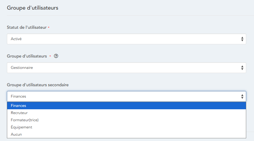 Remarque : le groupe d'utilisateurs secondaire « Recruteur » est destiné à donner accès à des données spécifiques au recrutement telles que « Candidats », « Demandes », etc., et non à des données relatives aux employés.